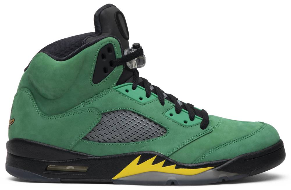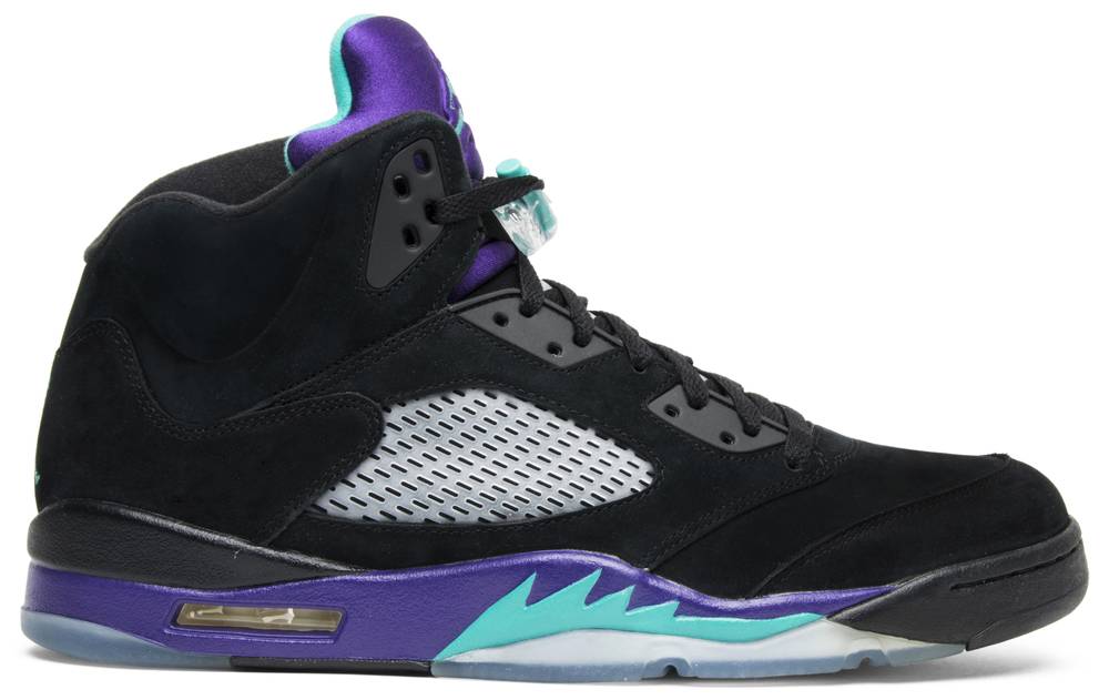 Pomimo wielu świetnych wersji kolorystycznych Air Jordan 5, największe poruszenie wywołała chyba wariacja kolorystyczna zwana dziś popularnie „Grape”. Było to połączenie bieli z fioletem i szmaragdem. Nie trudno wyobrazić sobie efekt tego posunięcia, biorąc pod uwagę, że do kompletu można było dokupić nawiązującą kolorystycznie do buta odzież. Jordan nigdy nie zagrał w „Grape’ach” podczas meczu NBA, ale nie przeszkodziło im to stać się jedną z najbardziej pożądanych wersji „Piątek” w historii. Mogą się z nimi równać tylko tzw. „Laney” nawiązujące kolorystyką do licealnej drużyny MJ’a (Laney High Buccaneers z Wilmington w Północnej Karolinie) i wydany kilka lat temu dwupak „Toro Bravo” znany również jako „Raging Bull”.